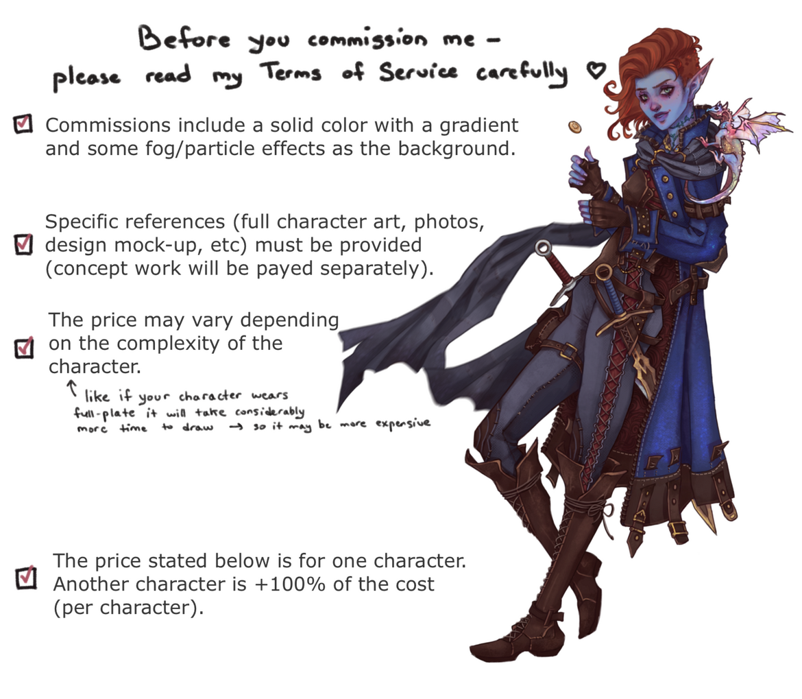 • with WISE bank transfers the fee is around $3-10.► It takes up to 1-1,5 months to finish the art (as I work on several artworks at the same, also it depends on the complexity of the art, for groups it may be longer). I usually try to specify the waiting time, but please make sure you're okay with that.► I take payments after flat colors are done and approved (so when 50-70% of the art is complete). I also may ask for paying 50% upon approving the sketch, but I'll tell you about it in advance.► I do not offer refunds once the piece is completed.► By commissioning me, you’ll accept the appearance of the artwork on my social media (with proper credit to you), but depending on the situation, you certainly can ask me not to do it.► Any major changes will be decided during the sketch phase. After that, small edits can be requested at lineart/flat colours phase and final rendering, one per phase. Any other changes will be charged separately.